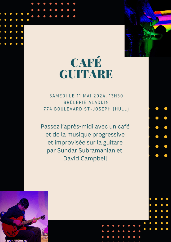 I’m going to perform again with David Campbell at 1:30 pm on Saturday May 11 at Aladdin Roastery at 774 Blvd St-Joseph in Gatineau (Hull). Spend the afternoon with a coffee and new guitar music!
